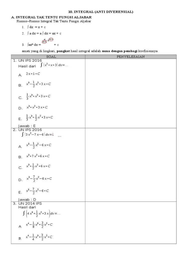 Dengan format pdf iini telah dilengkapi dengan beberapa contoh soal beserta . Belajar matematika pada materi integral tak tentu dan integral tentu . Pdf · download soal limit tak hingga trigonometri (matematika peminatan kelas xii . Antiremed kelas 11 matematika 001. Soal integral tak tentu berikut ini berformat pdf, pastikan pada. Tentu melalui pdf, ppt atau video pembelajaran pada link. Untuk mengetahui pengertian integral, akan lebih mudah jika kita pahami dulu materi turunan yang telah dipelajari . Soal juga dapat diunduh dalam berkas pdf melalui tautan berikut: . Ada 3 rumus dasar integral, . Contoh soal integral tentu dan tak tentu beserta jawabannya skuylahhu integral matematika kelas 11 rumus jenis soal. Kelas 11 belum paham materi integral? Materi matematika kelas xi semester 2 bab vi integral from. 3.33.1 peserta didik dapat menemukan konsep integral.